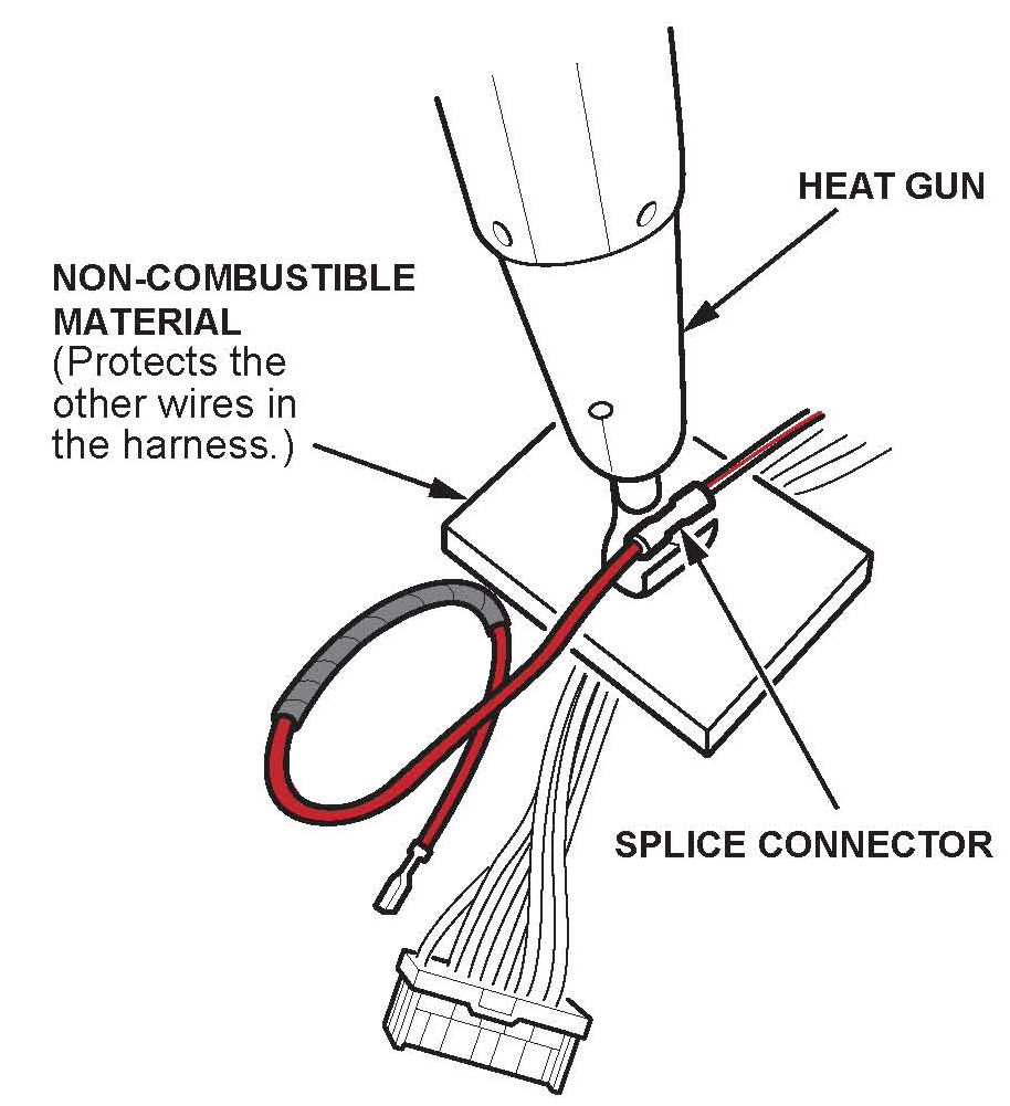 16. With a non-combustible material between the wire and the vehicle wire harness, use a heat gun to shrink the splice connector casing.