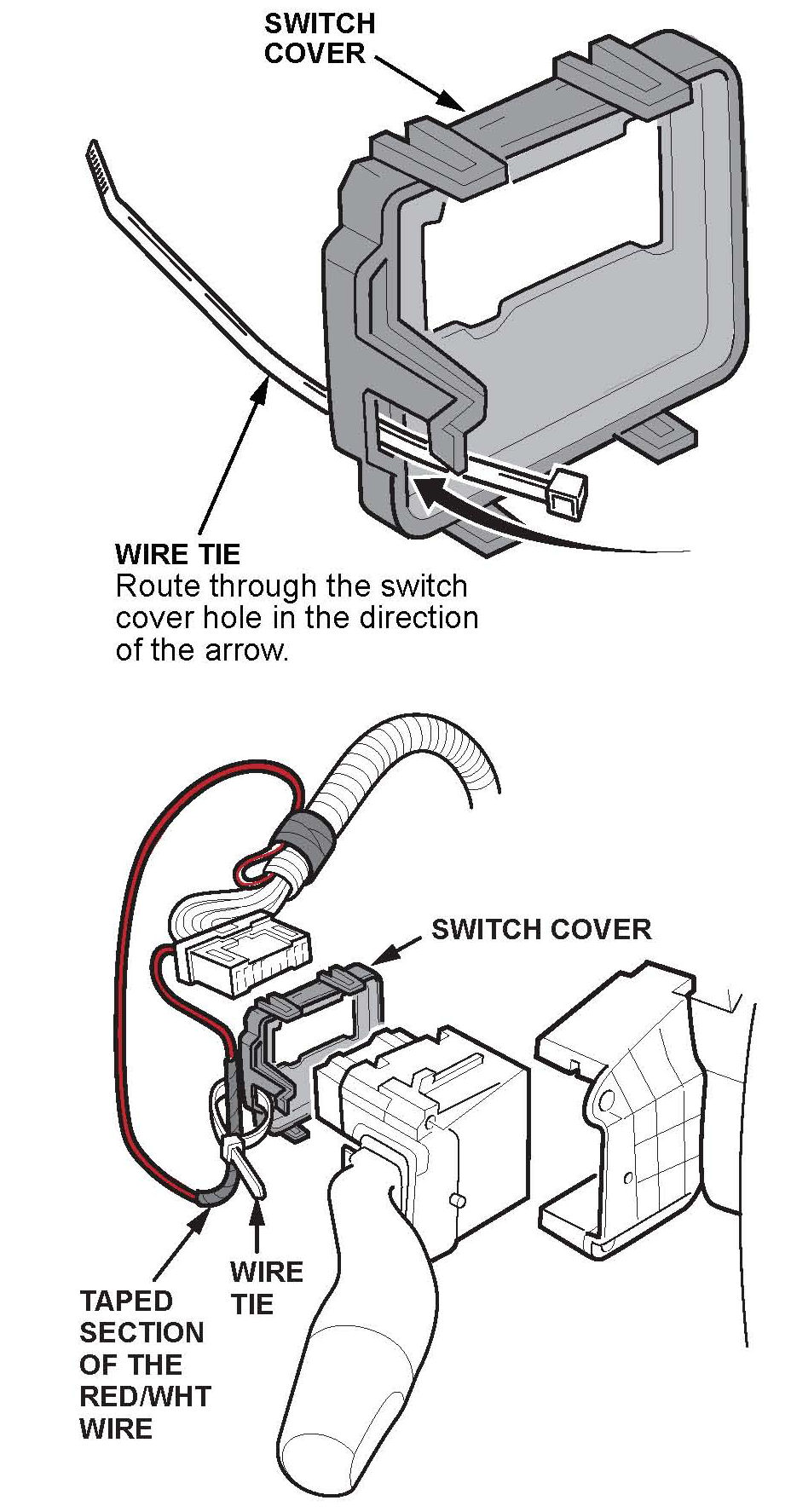 20. As shown, route the wire tie from the kit through the hole in the lower corner of the switch cover. Then use the wire tie to secure the RED/WHT wire (in the section you taped in step 11) to the switch cover. Cut off the excess wire tie.
