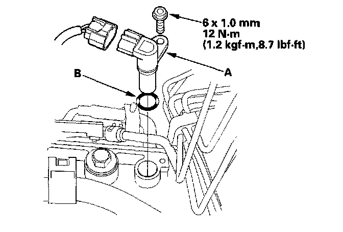 3. Install the new O-ring (B) on the countershaft speed sensor, then install the countershaft speed sensor in the transmission housing. Do not allow dust or foreign particles to enter the transmission.