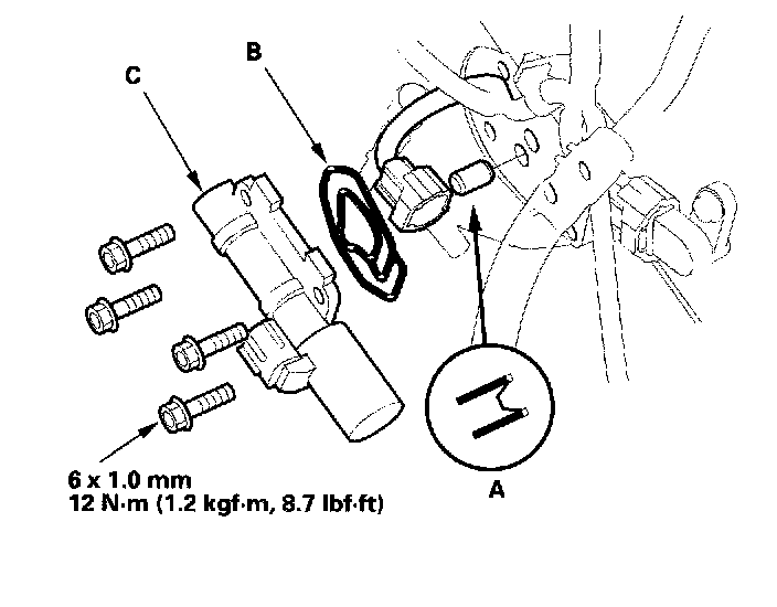 5. Install the new gasket (B) in the mounting groove of the A/T clutch pressure control solenoid valve C body properly, then install them on the transmission housing. Do not pinch the gasket.