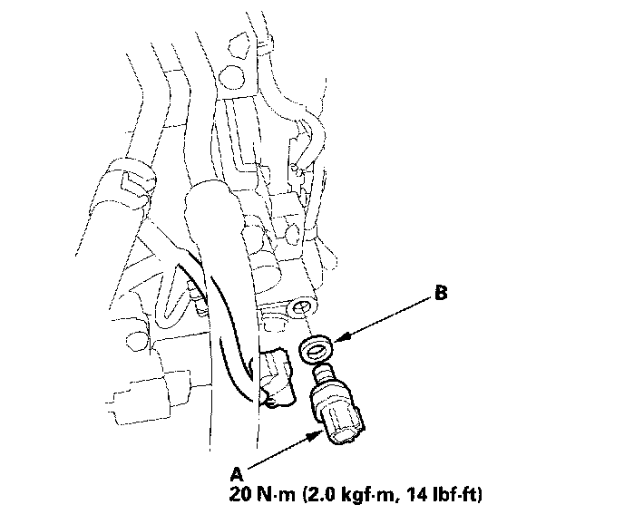 2. Replace the 4th clutch pressure switch, then install a new one with a new sealing washer (B). Tighten the switch on the metal part, not the plastic part.