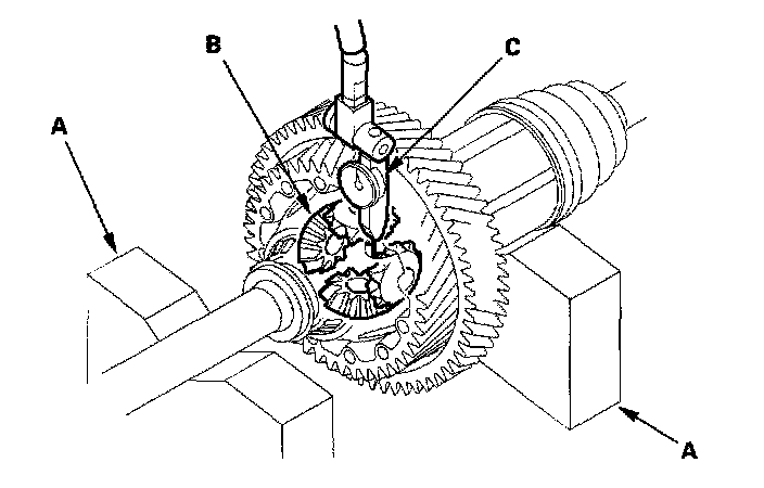 2. Check the backlash of the pinion gears (B) with a dial indicator (C).