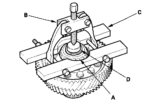 1. Remove the carrier bearing (A) with a commercially available bearing puller (B), bearing separator (C), and stepped adapter (D).