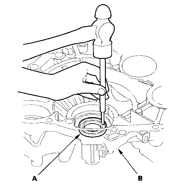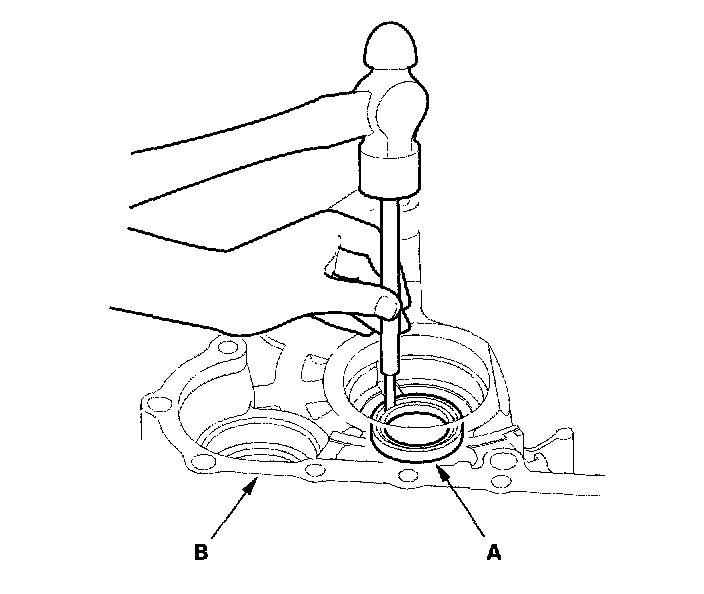 3. Remove the oil seal (A) from the torque converter housing (B).