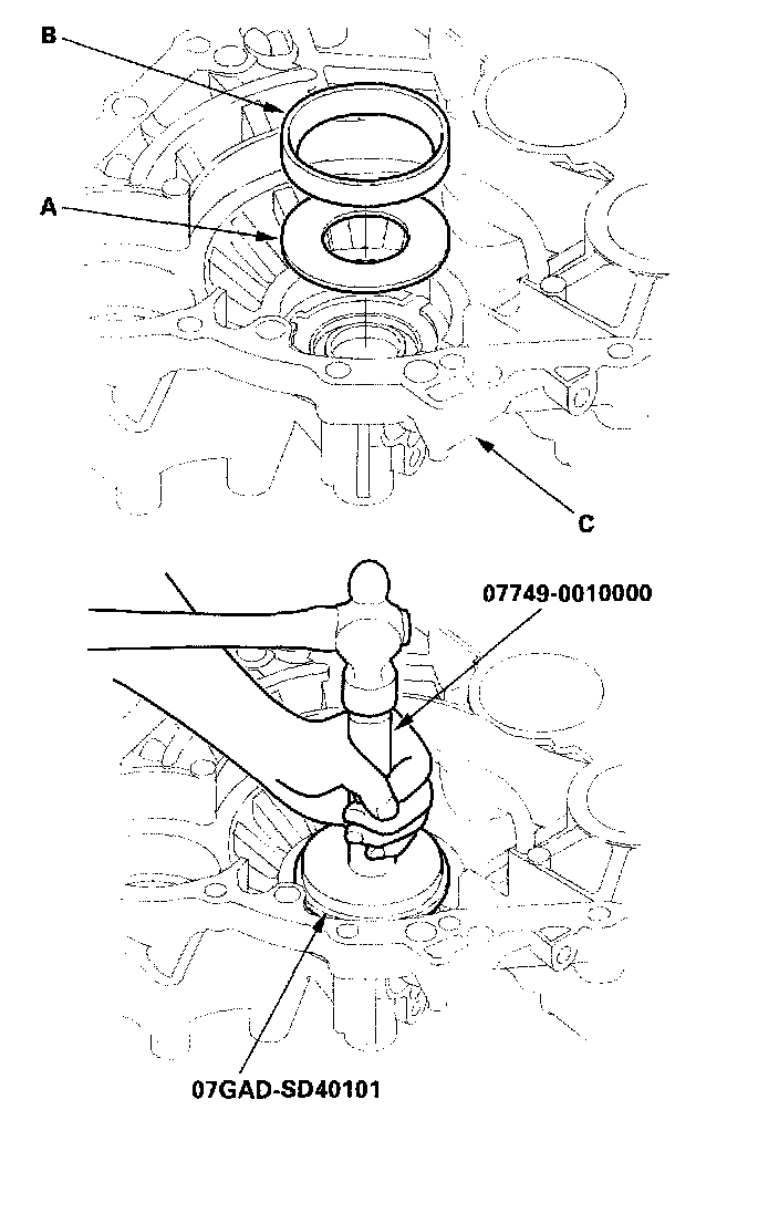 4. Install the thrust washer (A) and outer race (B) in the torque converter housing (C), and use the special tools to make sure the outer race bottoms out in the housing.