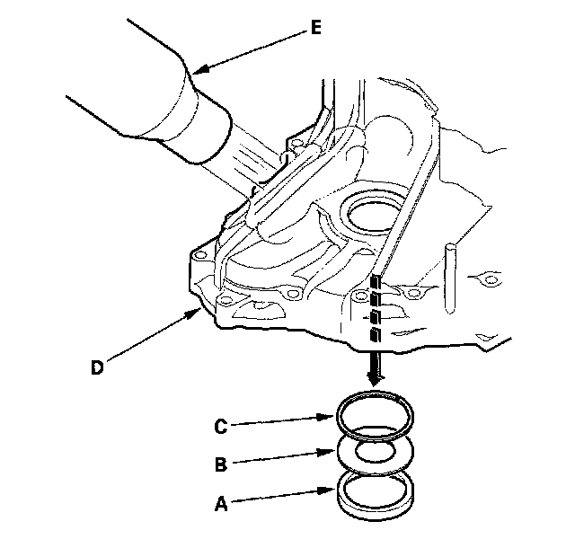 3. Install the thrust shim (A), thrust washer (B), and outer race (C) in the transmission housing (D) with the special tools.