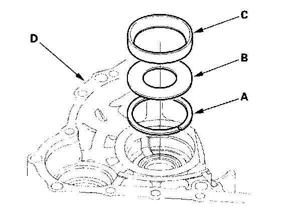 5. Install the thrust shim (A), thrust washer (B), and bearing outer race (C) in the transmission housing (D).