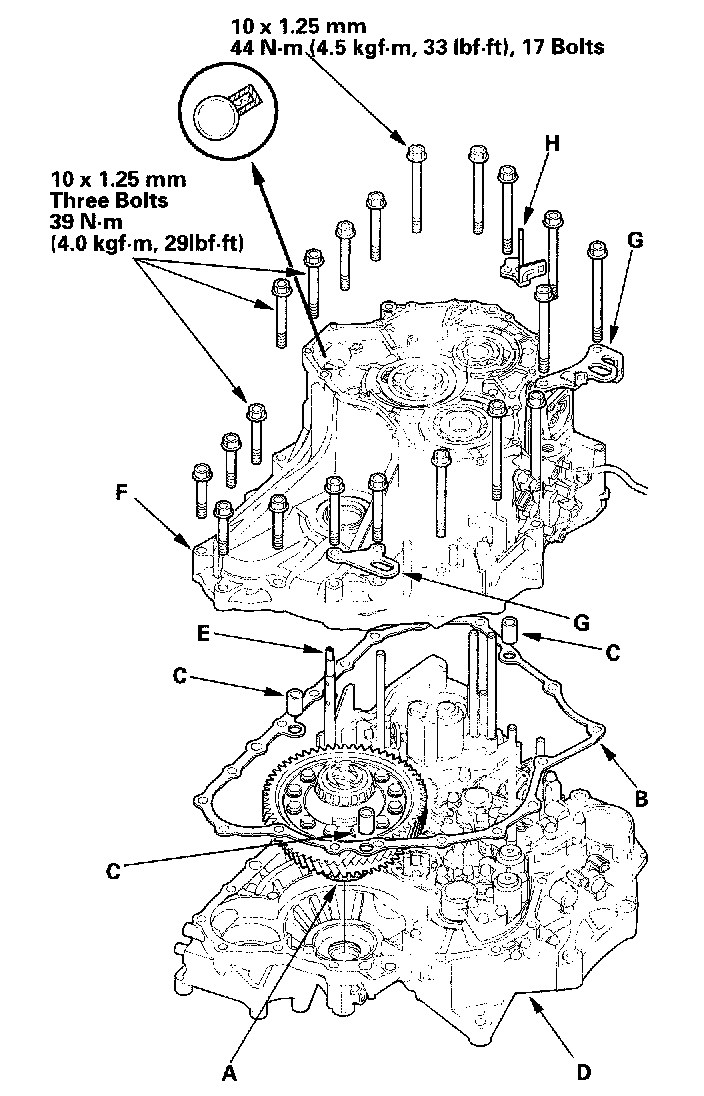 9. Install the transmission housing (F) with the transmission hangers (G) and harness clamp bracket (H), then tighten the bolts.