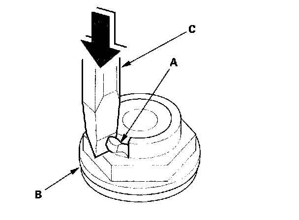 14. Cut the lock tabs (A) of each shaft locknut (B) using a chisel (C). Then remove the locknuts and conical spring washers from each shaft.