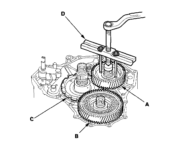 18. Remove the mainshaft 3rd gear (A), secondary shaft idler gear (B), and park gear (C) with a puller (D).