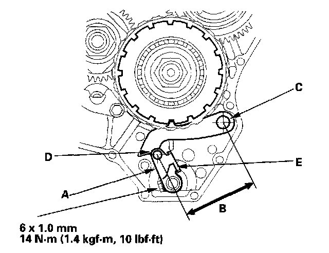 2. Measure the distance (B) between the park pawl shaft (C) and the park lever roller pin (D).