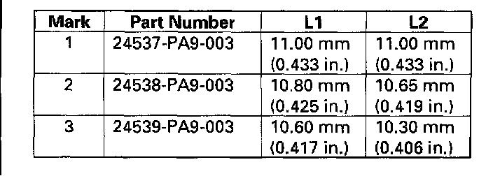 3. If the measurement is out of tolerance, select and install the appropriate park lever stop (E) from the table.