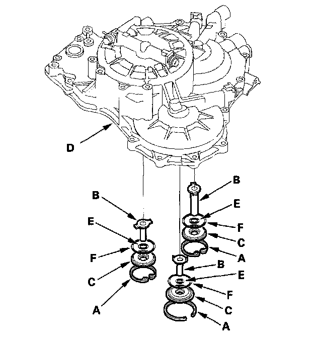 1. Remove the snap rings (A), ATF feed pipes (B), and feed pipe flanges (C) from the end cover (D).