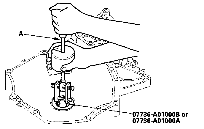 1. Remove the mainshaft bearing and oil seal with the special tool and a commercially available 3/8"-16 slide hammer (A).