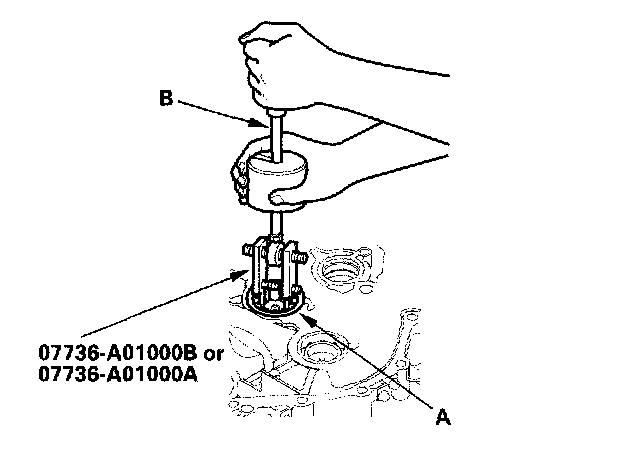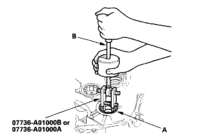 1. Remove the secondary shaft bearing (A) with the special tool and a commercially available 3/8"-16 slide hammer (B).