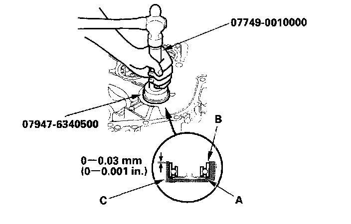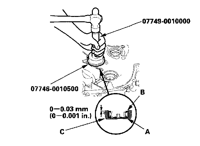 3. Install the new bearing (B) into the housing (C) with the special tools.