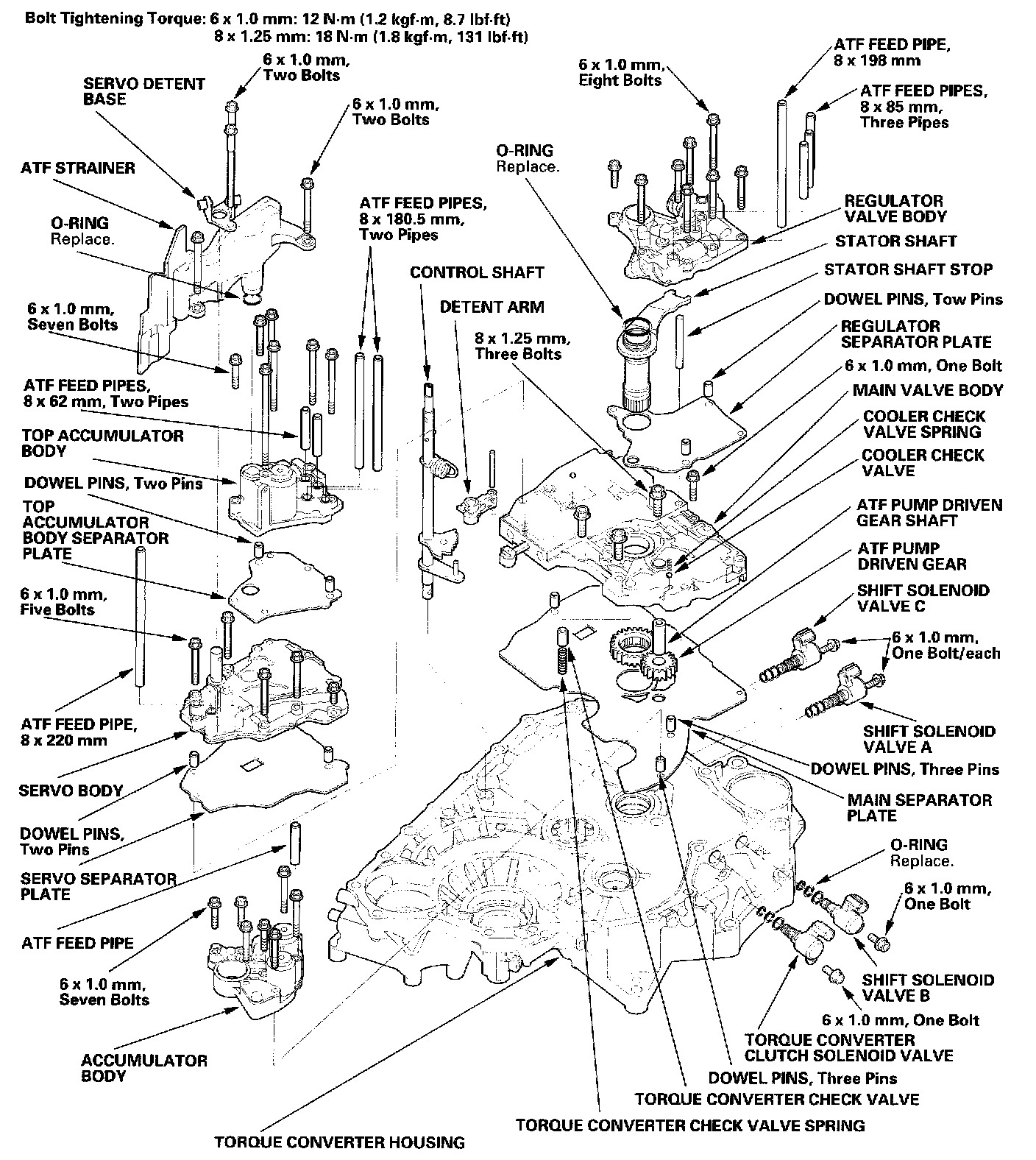 Install the one ATF feed pipe in the servo body, four pipes in the regulator valve body, four pipes in the top accumulator body, and one pipe in the accumulator body.