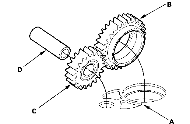 1. Install the main separator plate (A) and three dowel pins on the torque converter housing. Then install the ATF pump drive gear (B), driven gear (C), and ATF pump driven gear shaft (D). Install the ATF pump driven gear with its grooved and chamfered side facing down.