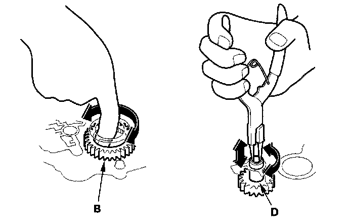 2. Install the main valve body (one 6 mm bolt and three 8 mm bolts). Make sure the ATF pump drive gear (B) rotates smoothly in the normal operating direction, and the ATF pump driven gear shaft (D) moves smoothly in the axial and normal operating direction.