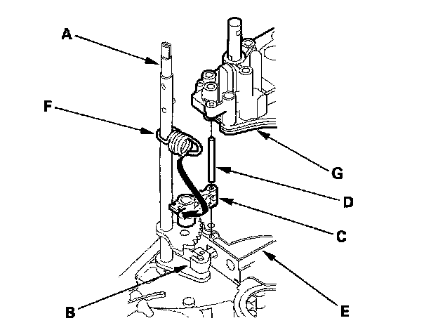 9. Install the detent arm (C) and arm shaft (D) in the main valve body (E), then hook the detent arm spring (F) to the detent arm.
