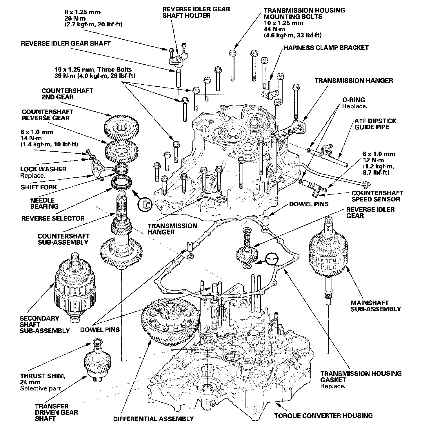 1. Install the 24 mm thrust shim on the transfer driven gear shaft, then install the shaft in the torque converter housing.