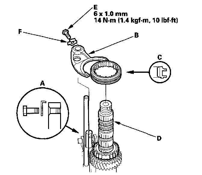 4. Turn the shift fork shaft (A) so the large chamfered hole is facing the fork bolt hole. Then install the shift fork (B) and reverse selector (C) together on the shift fork shaft and countershaft (D). Secure the shift fork to the shift fork shaft with the lock bolt (E) and a new lock washer (F), then bend the lock washer against the bolt heart.