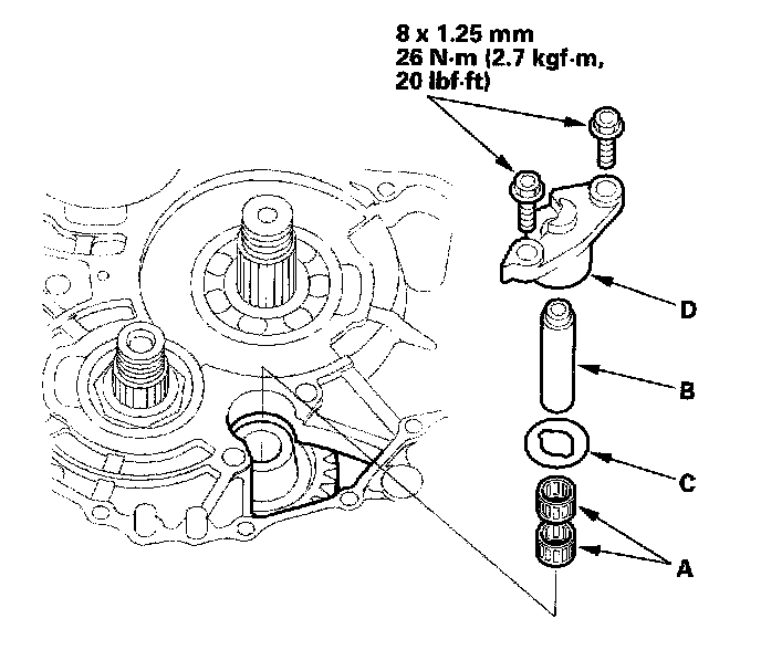 11. Engage the reverse idler gear with the countershaft reverse gear and the mainshaft reverse gear. Then install the needle bearings (A), reverse idler gear shaft (B), and thrust washer (C) in the reverse idler gear, and install the reverse idler gear shaft holder (D) on the transmission housing.