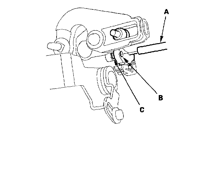 8. Insert a 6.0 mm (0.24 inch) pin (A) into the positioning hole (B) on the detent plate through the positioning hole (C) on the control bracket. The shift lever is secured in the [N] position.