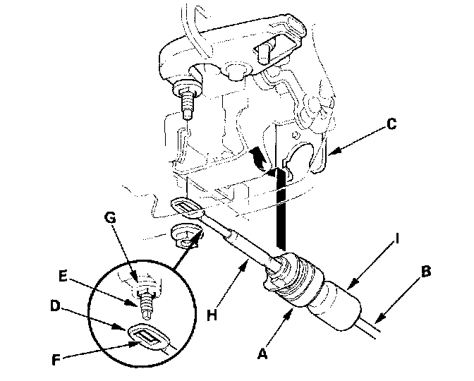 9. Align the socket holder (A) on the shift cable (B) with the slot in the shift cable bracket (C), then slide the holder into the bracket. Install the shift cable end (D) over the mounting stud (E) by aligning its square hole (F) with the square fitting (G) at the bottom of the stud. Rotate the holder a quarter turn to secure the shift cable. Do not install the shift cable by twisting the shift cable guide (H) and damper (I).