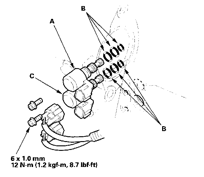 Shift Solenoid Valves A and C ReplacementNOTE: If shift solenoid valves A and C are replaced or removed at the same time, be sure to reinstall them correctly. The connector color of shift solenoid valve A is black, and the connector color of shift solenoid valve C is brown.