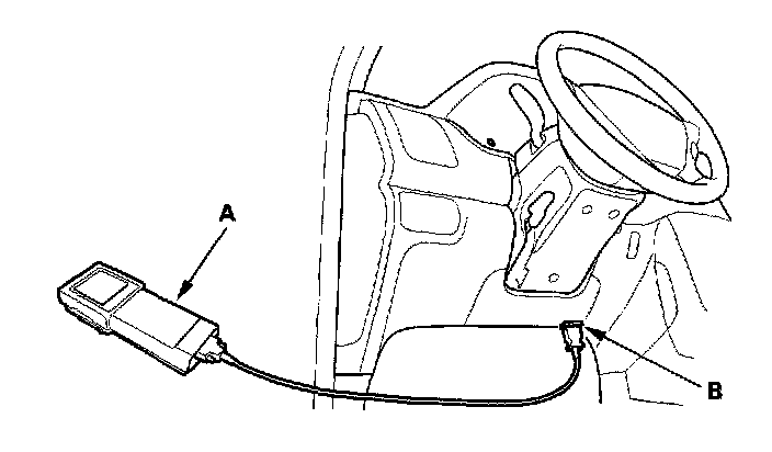Initialization with Honda PGM Tester:1. With the ignition switch OFF, connect the Honda PGM Tester (A) to the 16P DLC (B) located behind the driver's dashboard lower cover.