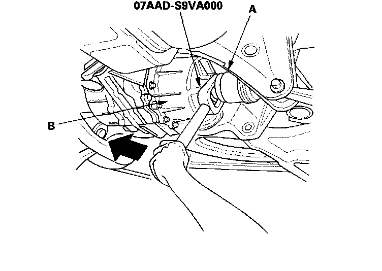 5. Using the special tool, pry out both inboard joints (A) from the differential (B).