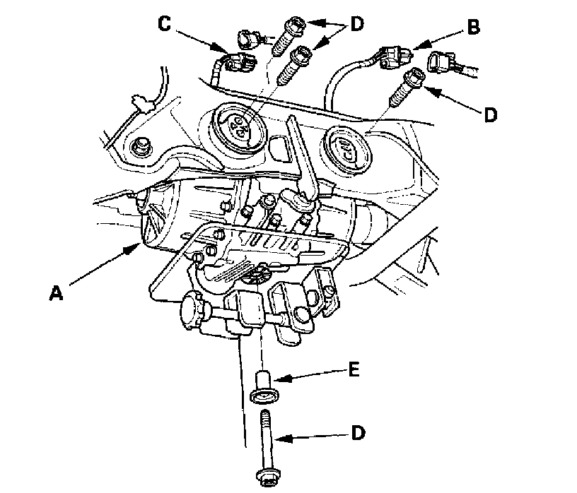 7. Disconnect the 6P (B) and 2P (C) connectors, then remove the mounting bolts (D) and washer (E).