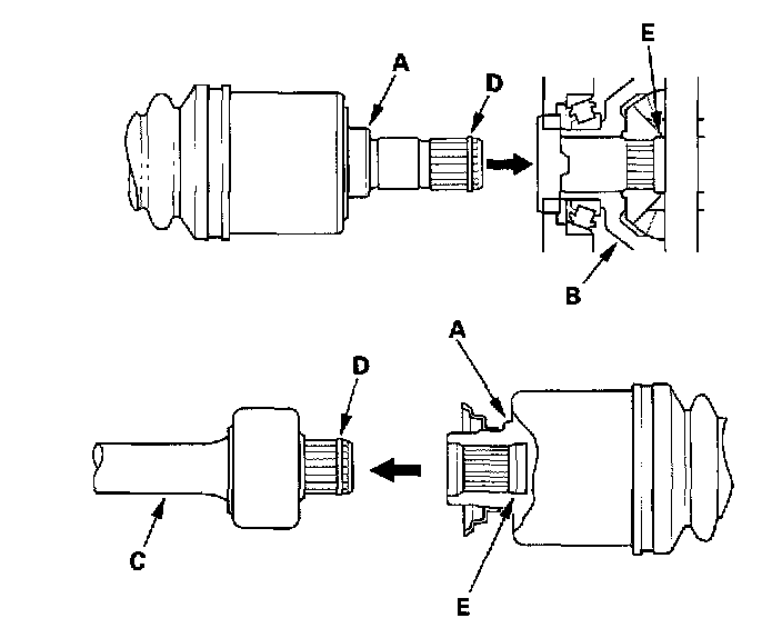 3. Clean the areas where the driveshaft contacts the differential thoroughly with solvent or brake cleaner, and dry with compressed air. Insert the inboard end (A) of the driveshaft into the differential (B) or intermediate shaft (C) until the set ring (D) locks in the groove (E).