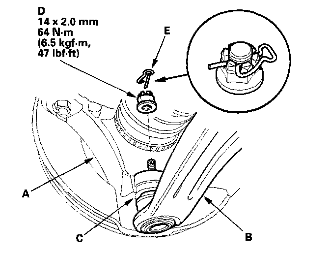 5. Install the knuckle (A) onto the lower arm (B). Be careful not to damage the ball joint boot (C). Wipe off the grease before tightening the nut at the ball joint. Torque the new castle nut (D) to the lower torque specification, then tighten it only far enough to align the slot with the pin hole. Do not align the nut by loosening.