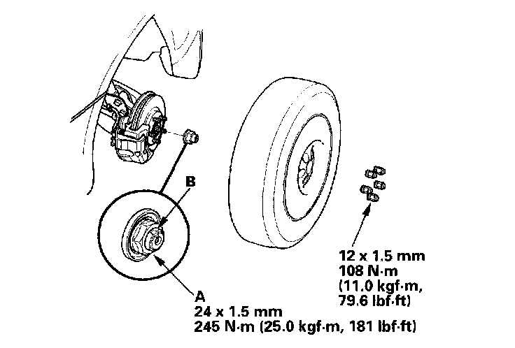 8. Install a new spindle nut (A), then tighten the nut. After tightening, use a drift to stake the spindle nut shoulder (B) against the driveshaft.