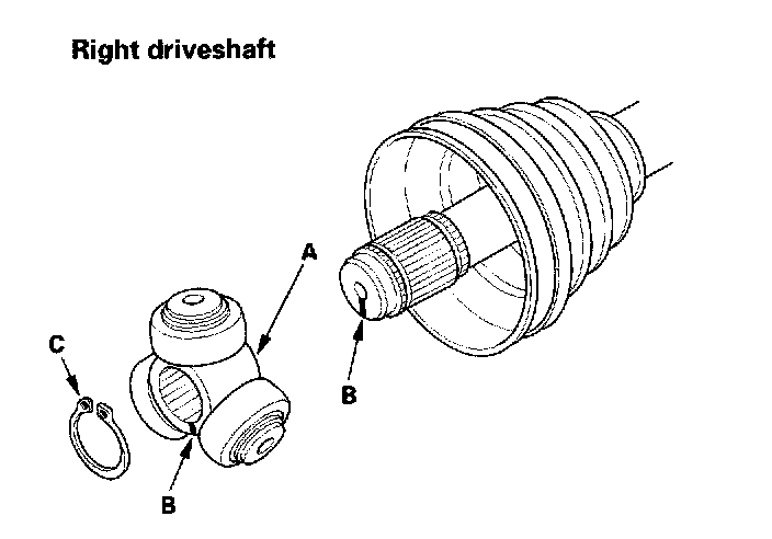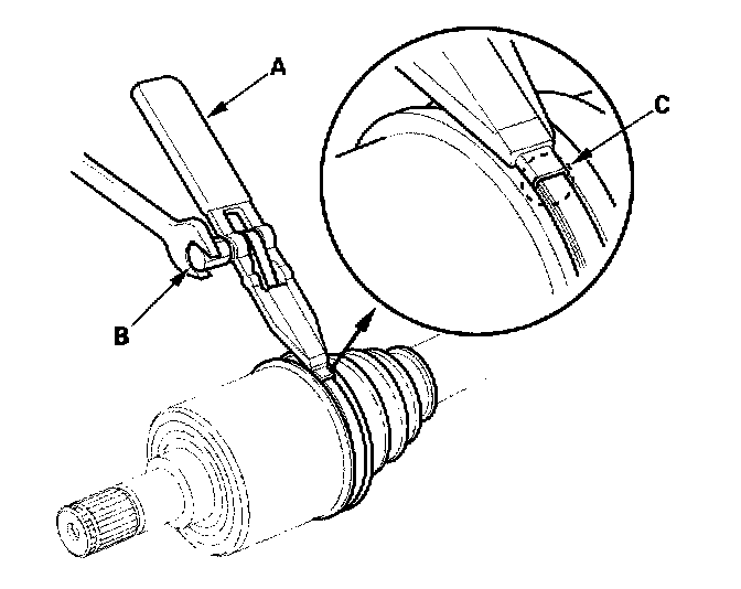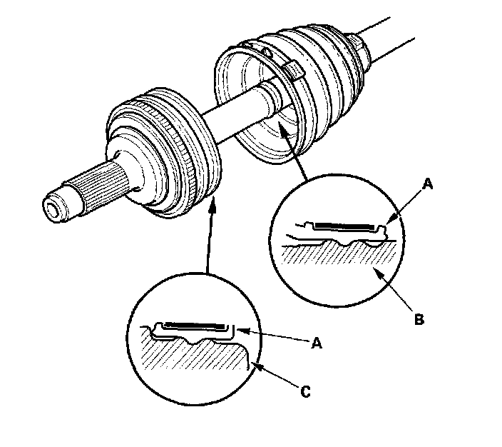 9. Fit the boot (A) ends onto the driveshaft (B) and outboard joint (C).
