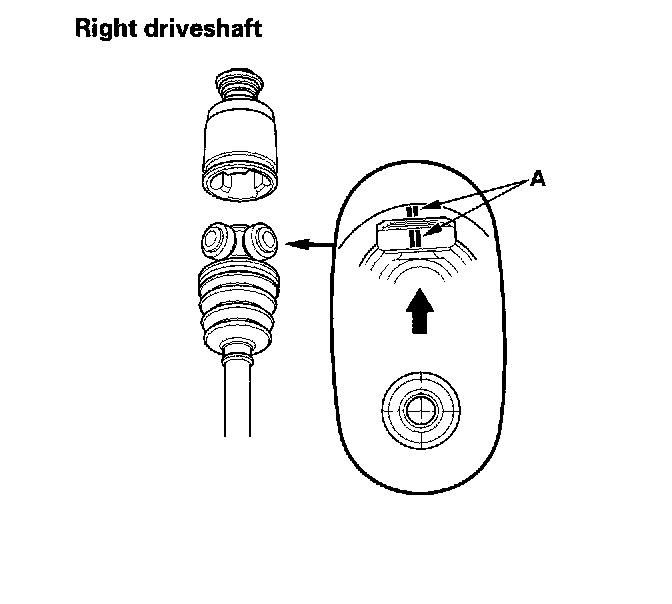 ^ Reinstall the inboard joint onto the driveshaft by aligning the marks (A) on the inboard joint and the rollers.