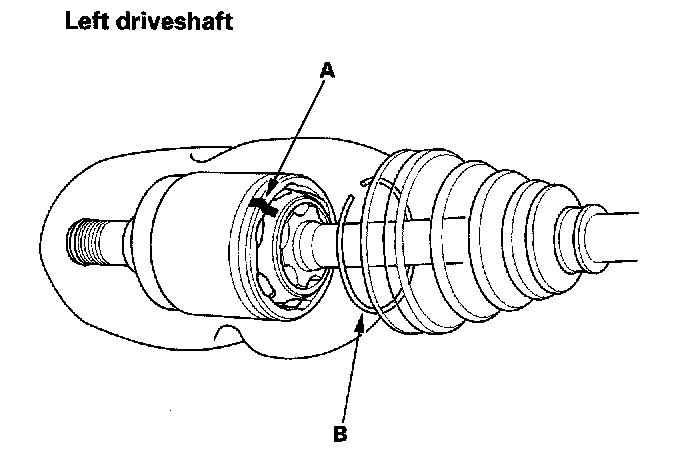 2. Install the inboard boot and boot band (B) on the driveshaft, then remove the vinyl tape. Be careful not to damage the inboard boot.