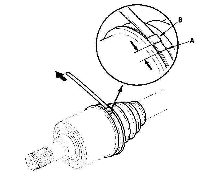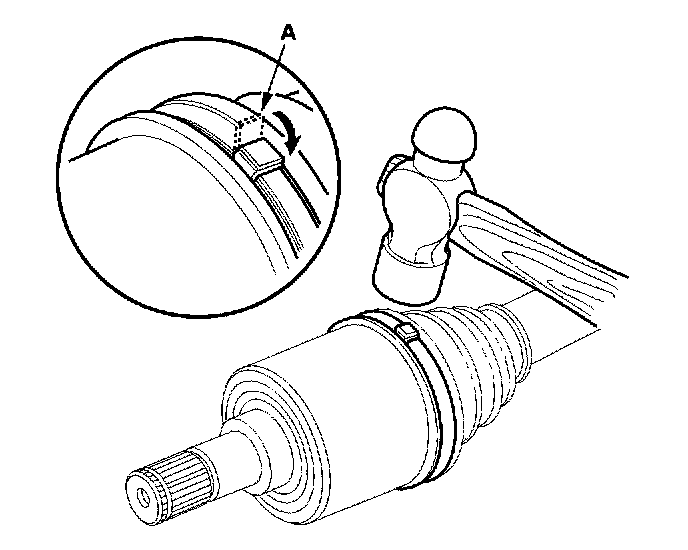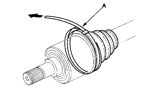13. Fit the boot ends onto the driveshaft and the inboard joint, then install the new double loop band (A) onto the boot.