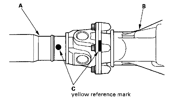 3. Install the spider (A) onto the driveshaft by aligning the marks (B) on the spider and the end of the driveshaft.