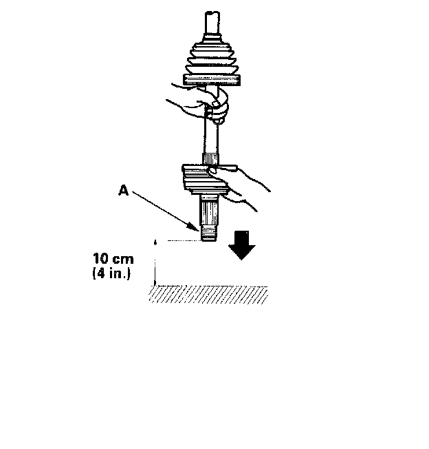 5. To completely seat the outboard joint, pick up the driveshaft and joint, and drop them from about 10 cm (4 inch) onto a hard surface. Do not use a hammer as excessive force may damage the driveshaft. Be careful not to damage the threaded section (A) of the outboard joint.