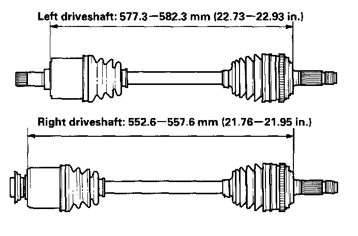 8. Adjust the length of the driveshafts to the figure below, then adjust the boots to halfway between full compression and full extension. Make sure the ends of the boots seat in the grooves of the driveshaft and joint.