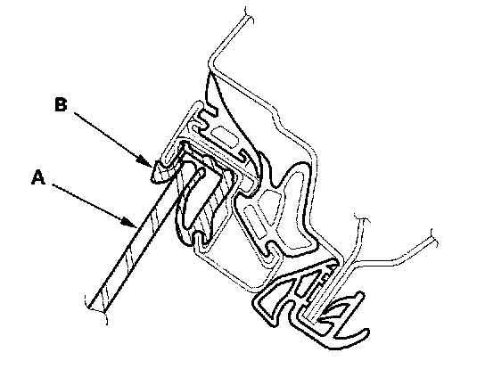 6. Raise the glass fully, and check for gaps. Check that the glass (A) contacts the glass run channel (B) evenly.