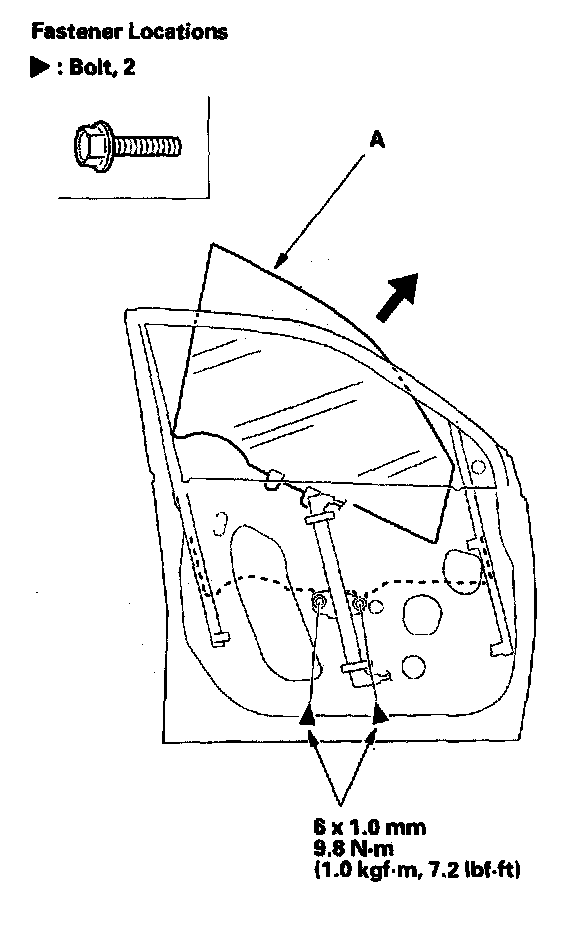 3. Carefully move the glass (A) until you can see the bolts, then remove them. Carefully pull the glass out through the window slot. Take care not to drop the glass inside the door.
