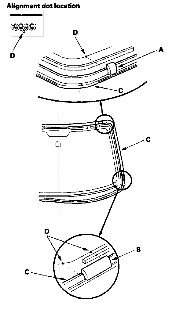 - Be sure the molding upper seal and molding side seal line up with the alignment dots (D).