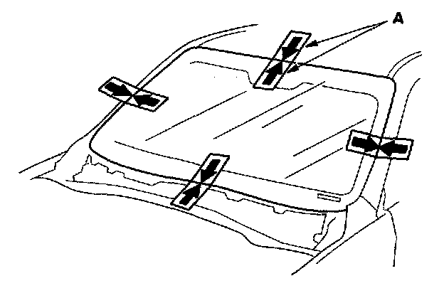 16. Set the windshield in the opening, and center it. Make alignment marks (A) across the windshield and body with a grease pencil at the four points shown. Be careful not to touch the windshield where adhesive will be applied.