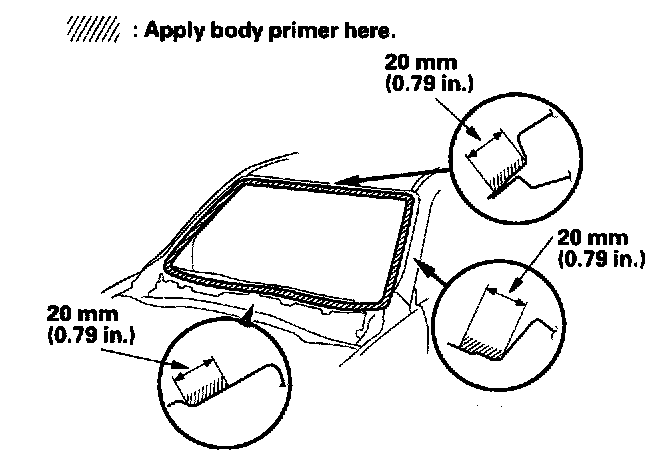 19. With a sponge, apply a light coat of body primer to the original adhesive remaining around the windshield opening flange. Let the body primer dry for at least 10 minutes: