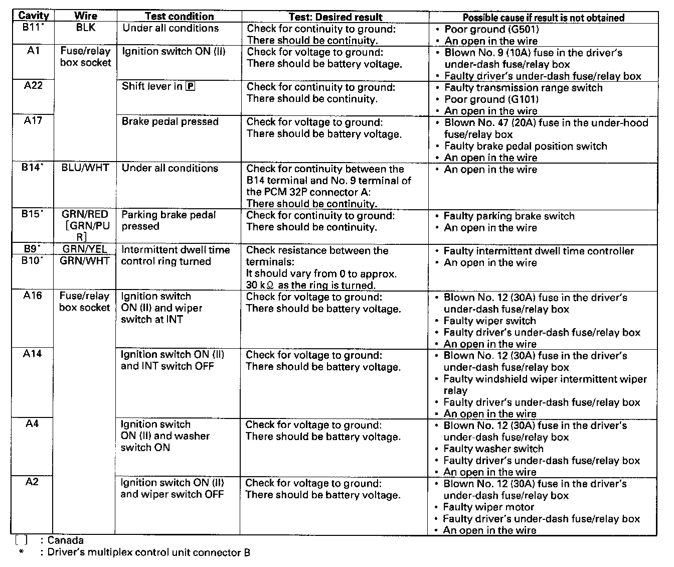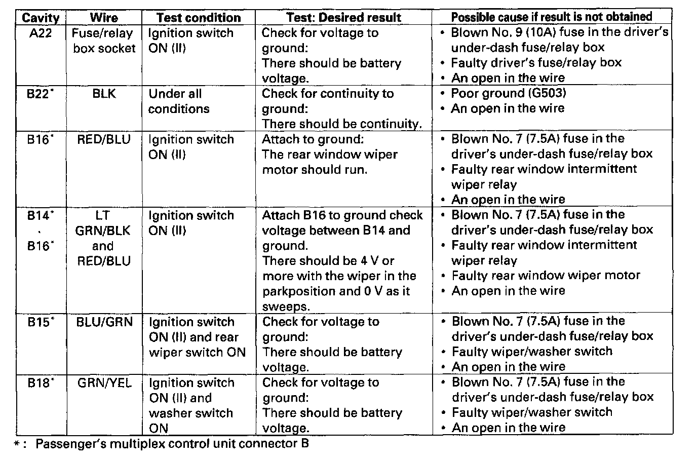 1. Before testing the wiper/washer control functions, troubleshoot the multiplex control system. Multiplex Control System Troubleshooting