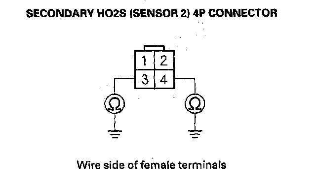7. Check for continuity between body ground and secondary HO2S (Sensor 2) 4P connector terminals No.3 and No.4 individually.